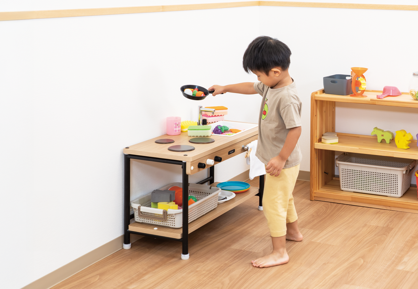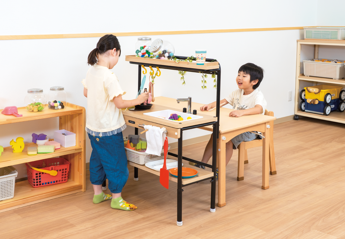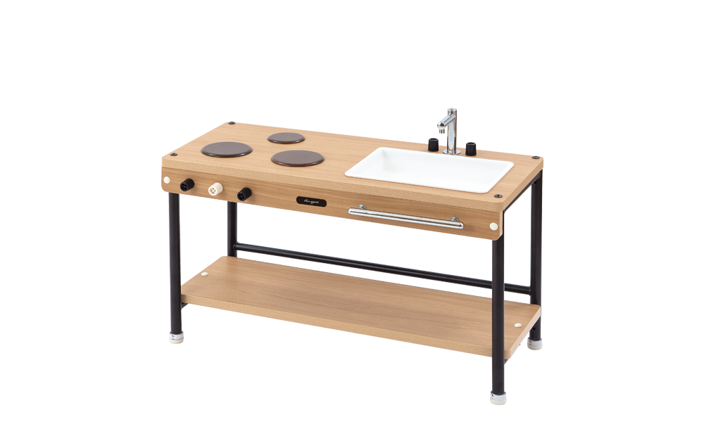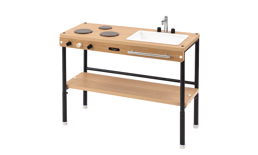 年少用と年長用を選べるキッチンです。テーブルを置いて対面仕様にすることで、友達と役割などを決めたごっこ遊びができ、コミュニケーション力や協調性を育んでいきます。