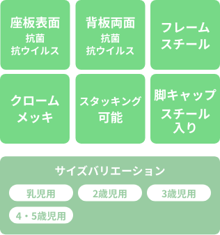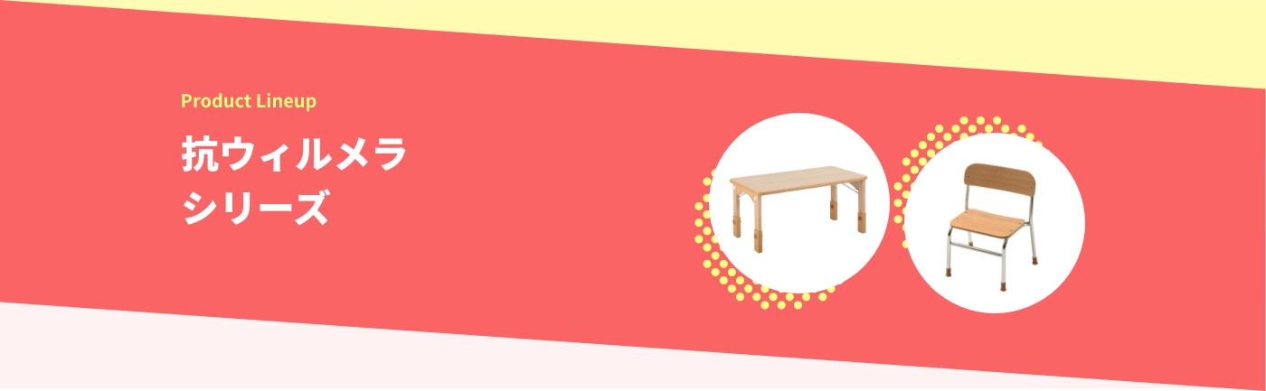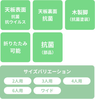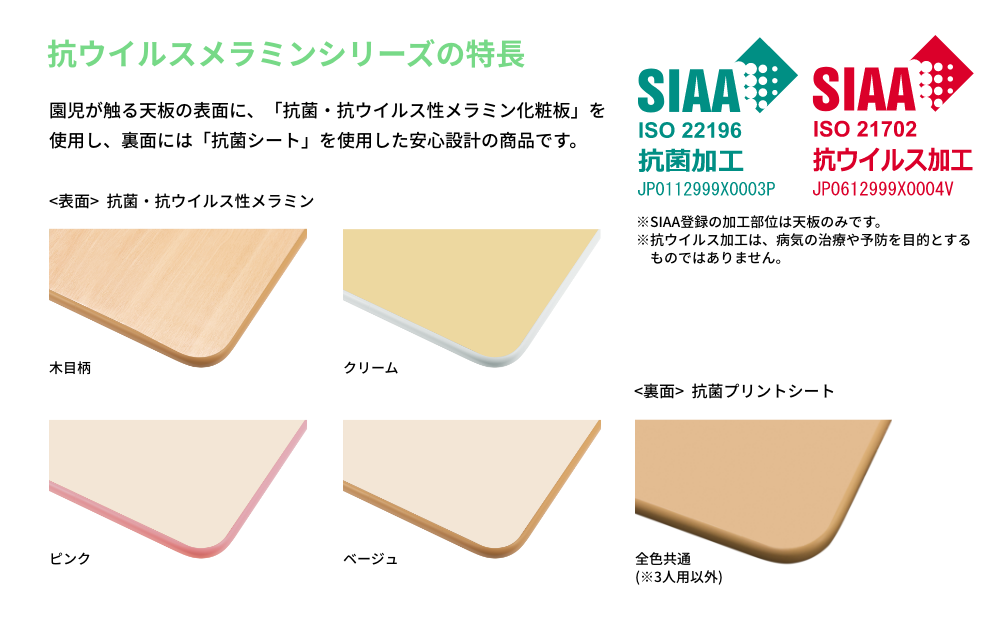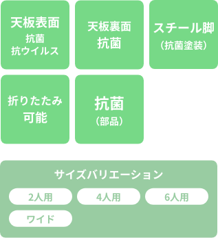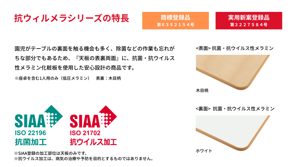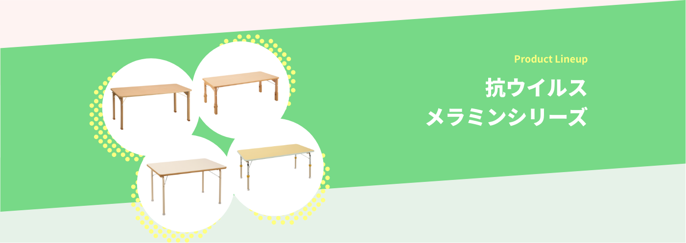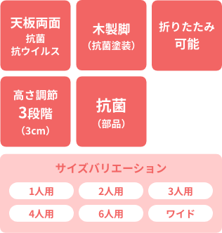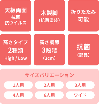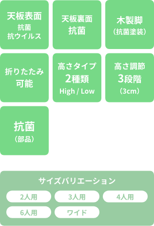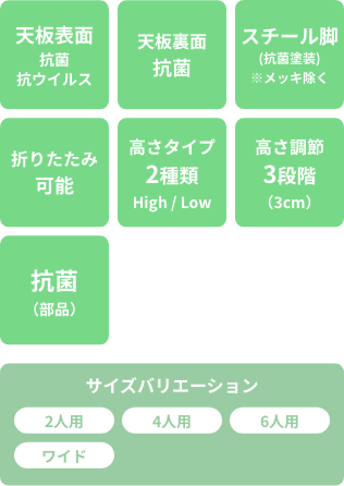 SIAA(抗菌製品技術協議会)に自主登録した抗菌・抗ウイルス性メラミン化粧板を『天板の表裏両面』に使用し、テーブルに高さ調節機能のついたシリーズです。