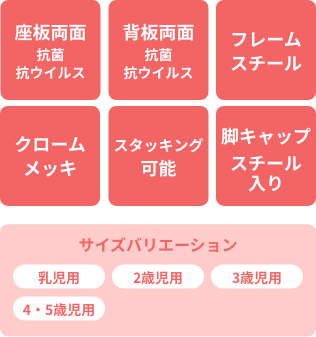 『座板・背板の表裏両面』に木目柄の抗菌・抗ウイルス性メラミン化粧板を使用した、キズに強く背・座板の小口が割れにくい、耐久性・耐摩耗性に優れた椅子です。