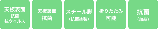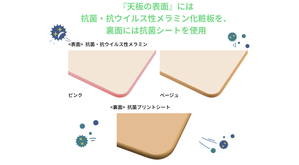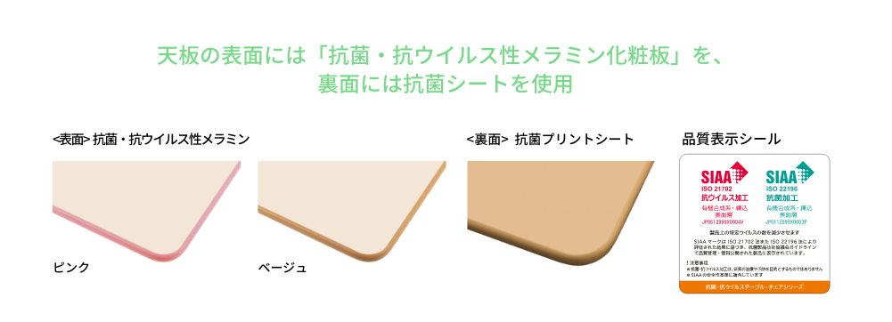 | 材質 | 天板 | 表面 : 抗菌・抗ウイルス性メラミン化粧板 ( アイボリー ) 裏面 : 抗菌プリント |