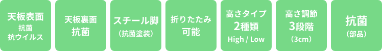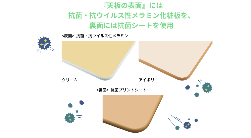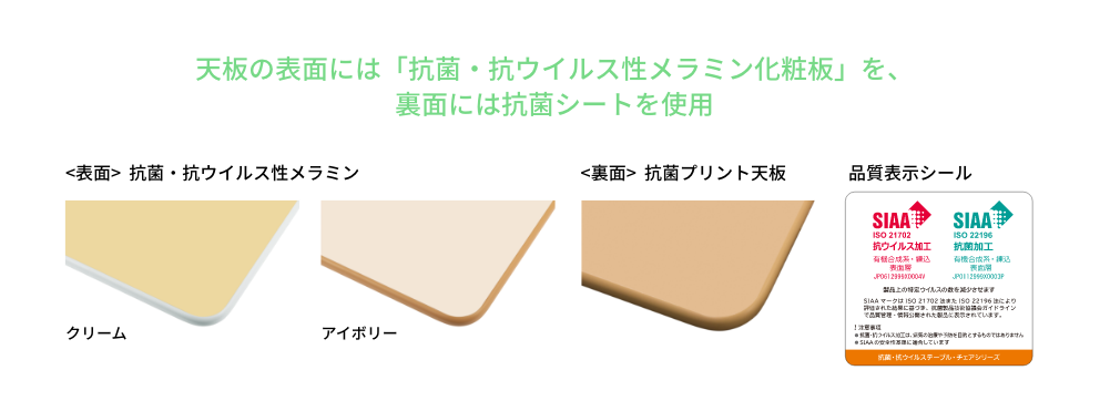 | 材質 | 天板 | 表面 : 抗菌・抗ウイルス性メラミン化粧板 ( クリーム・アイボリー ) 裏面 : 抗菌プリント |